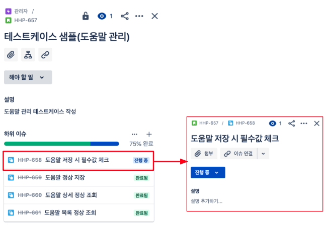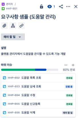 하위 이슈에 진척률과 진행 상황이 표시됨 -