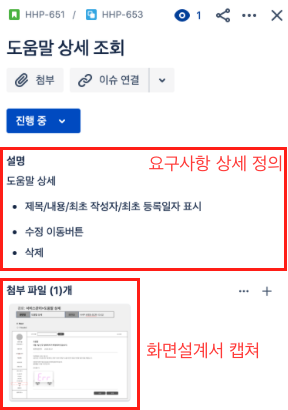 하위 이슈의 본문에는 화면 설계서와 최초의 요구사항을 명시