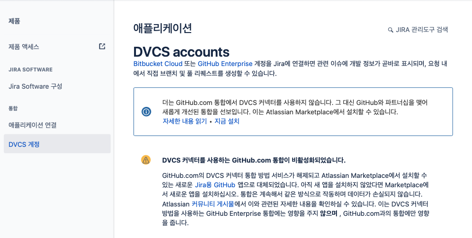 admin 권한이 있는 Jira 계정으로 로그인 해서 메뉴 제품(Products...)→ DVCS 계정 → GitHub 엔터프라이즈 계정으로 연결 로 접근한다. 이후 위에서 발급한 GitHub OAuth 토큰을 연결해주면 된다.