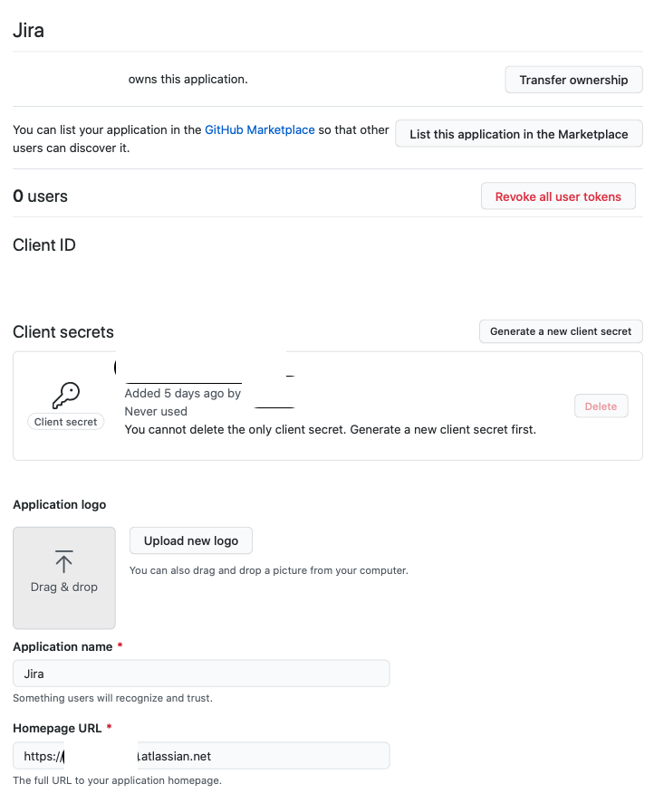 admin 권한이 있는 GitHub계정으로 접속하여 OAuth 토큰을 발급한다. 토큰 생성을 위한 메뉴는 Settings → Developer settings → OAut Apps → New OAuth App 으로 접근한다. Generate a new client secret을 선택하면 비밀번호가 생성되는데, 최초 발급 시에만 해당 비밀번호를 확인할 수 있으니 잘 복사해두길 바란다.