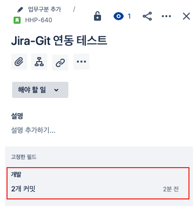Jira 이슈를 확인하면 커밋된 이력이 표시됨