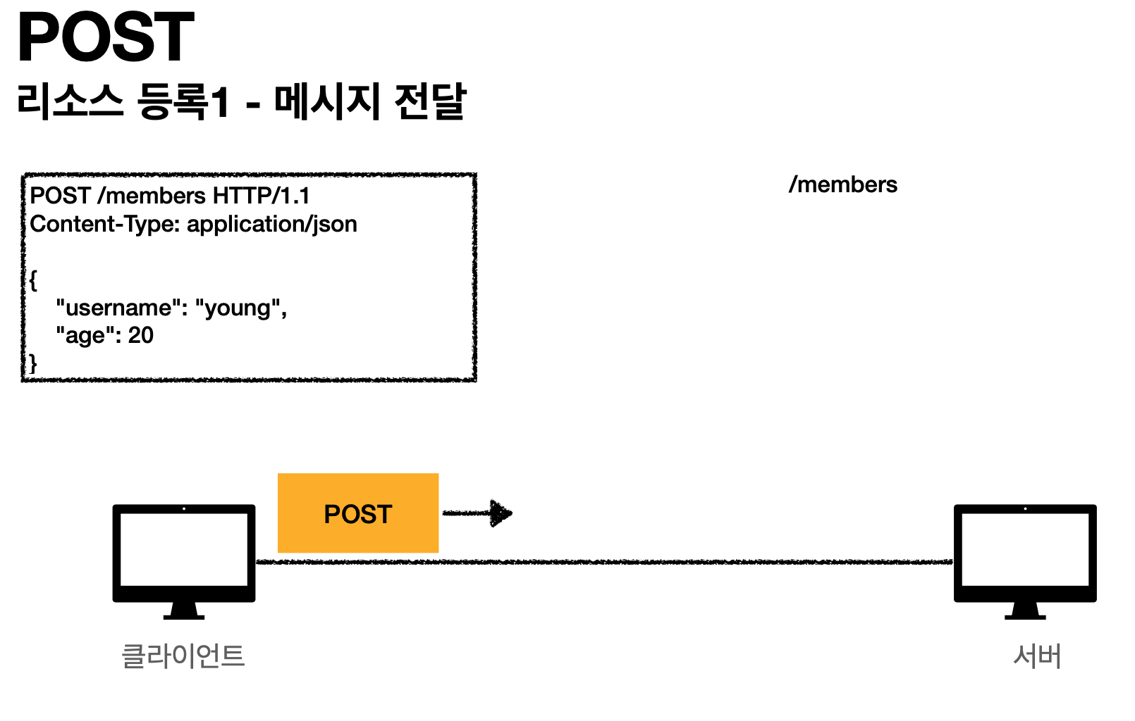 - POST, PUT, PATCH: 메시지 바디를 통해 데이터 전송