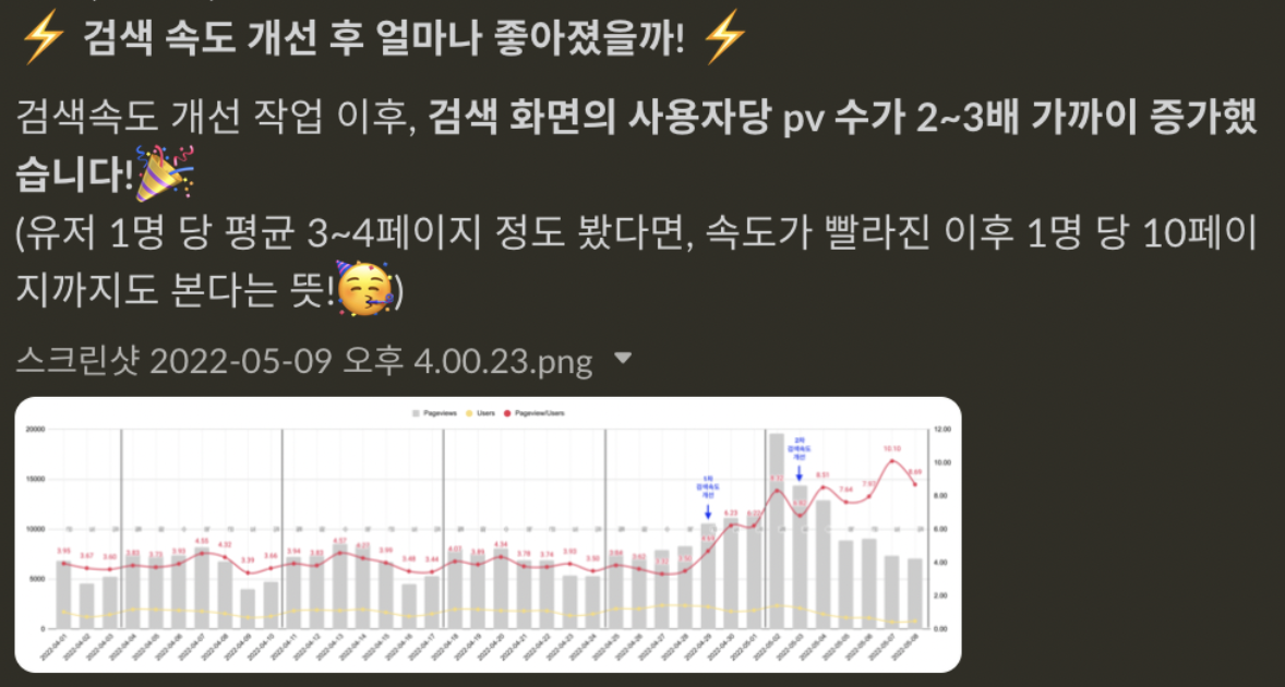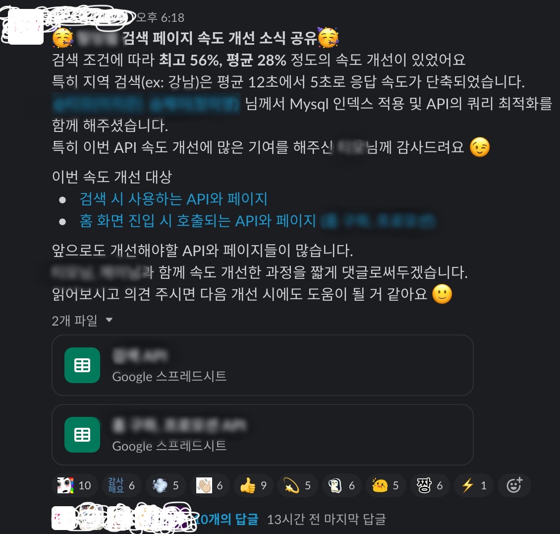 사내 메신저 공개채널에 검색 API 속도 개선 작업 결과를 공유했고, 댓글로 어떤 식으로 작업을 진행했는 지 세부적으로 공유했다.