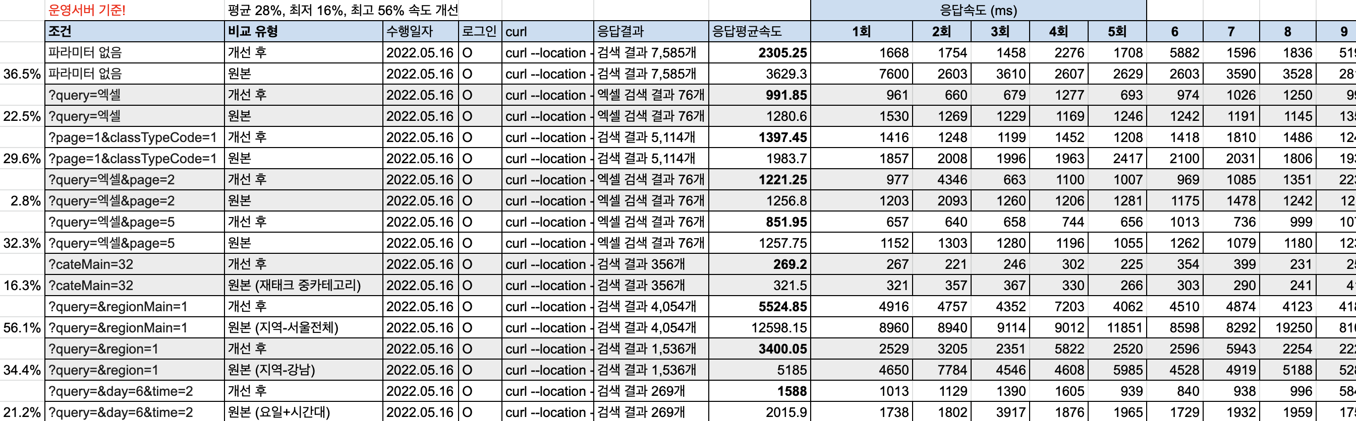 검색 조건별로 개선 전/후 응답값과 순서가 모두 일치하는 지 확인해야했다. 속도가 빨라졌더라도 기존과 다른 응답 결과를 반환한다면 개선이 아니라 약속되지 않은 다른 기능으로 바꿔버린 꼴이기 때문이다.