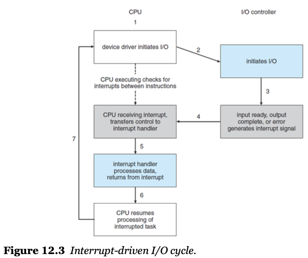 - interrupt-request line이라는 하드웨어로 요소로부터 interrupt가 오면 CPU는 해당 interrupt를 감지하여, CPU는 interrupt를 처리해주는 interrupt service routin(ISR)에게 제어권을 넘겨줌