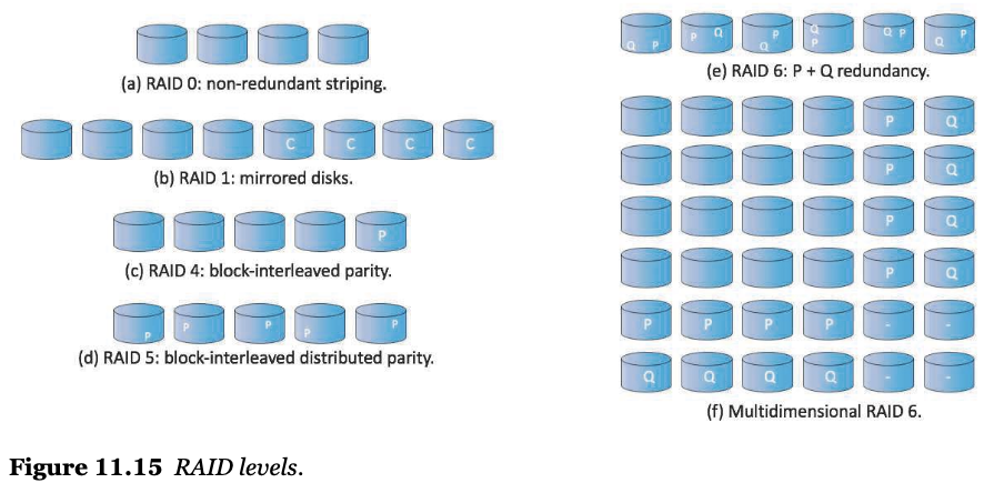 - RAID 6 : P + Q redundancy (Parity bit와 Queue를 둬서 더 강화시킴)
