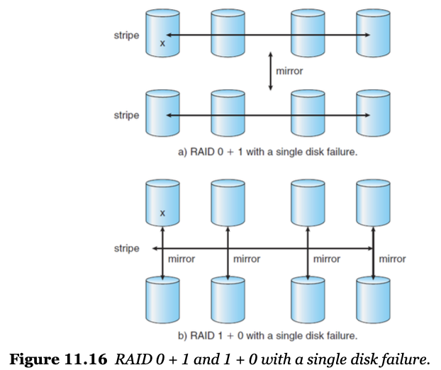 - mirroring : 높은 신뢰성을 가지나 너무 비쌈 (모든 디스크에 데이터를 동일하게 복제)