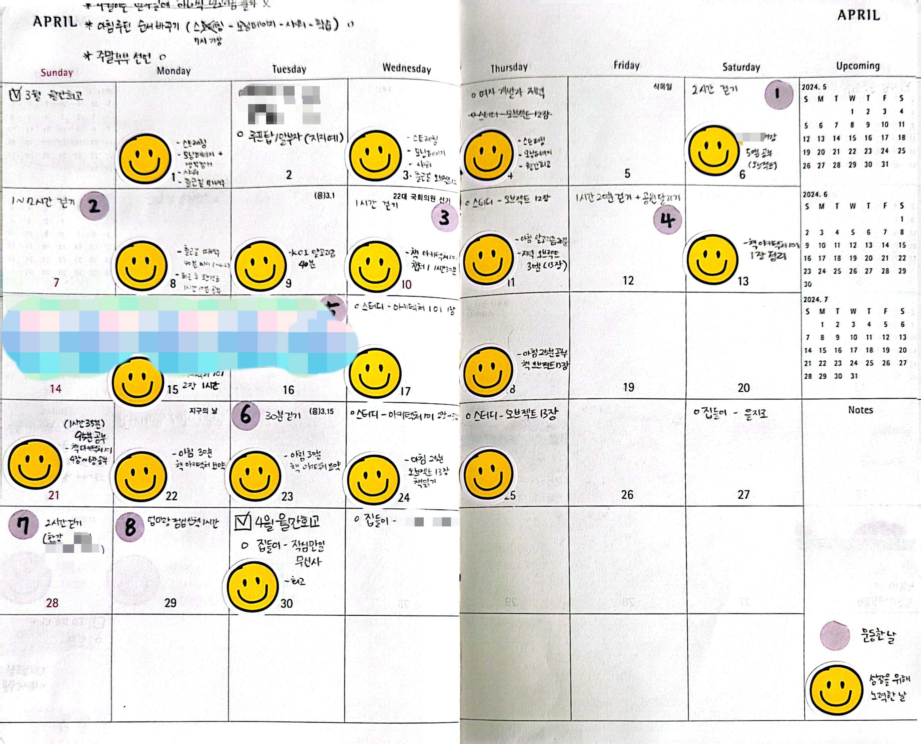 - 이번달부터 개인시간에 공부와 걷기에 많이 투자했다. 원래 아침에 30분 이상 공부한 날에는 스마일 스티커를 붙이고 있었는데 저녁시간도 활용하기로 마음 먹으면서 스마일 빈도가 촘촘해졌다.