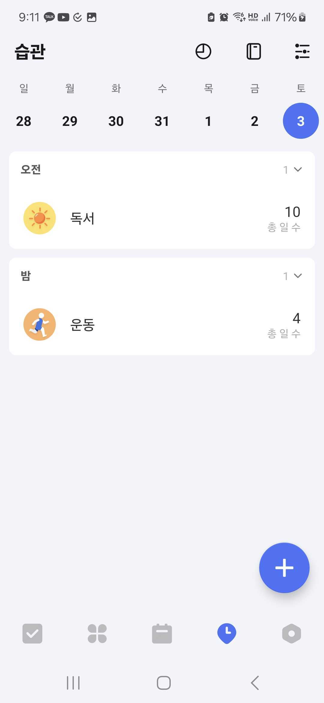 아침 루틴은 잘 정착했는데, 평일 저녁과 주말 루틴이 아직 정착이 되지 않았다.