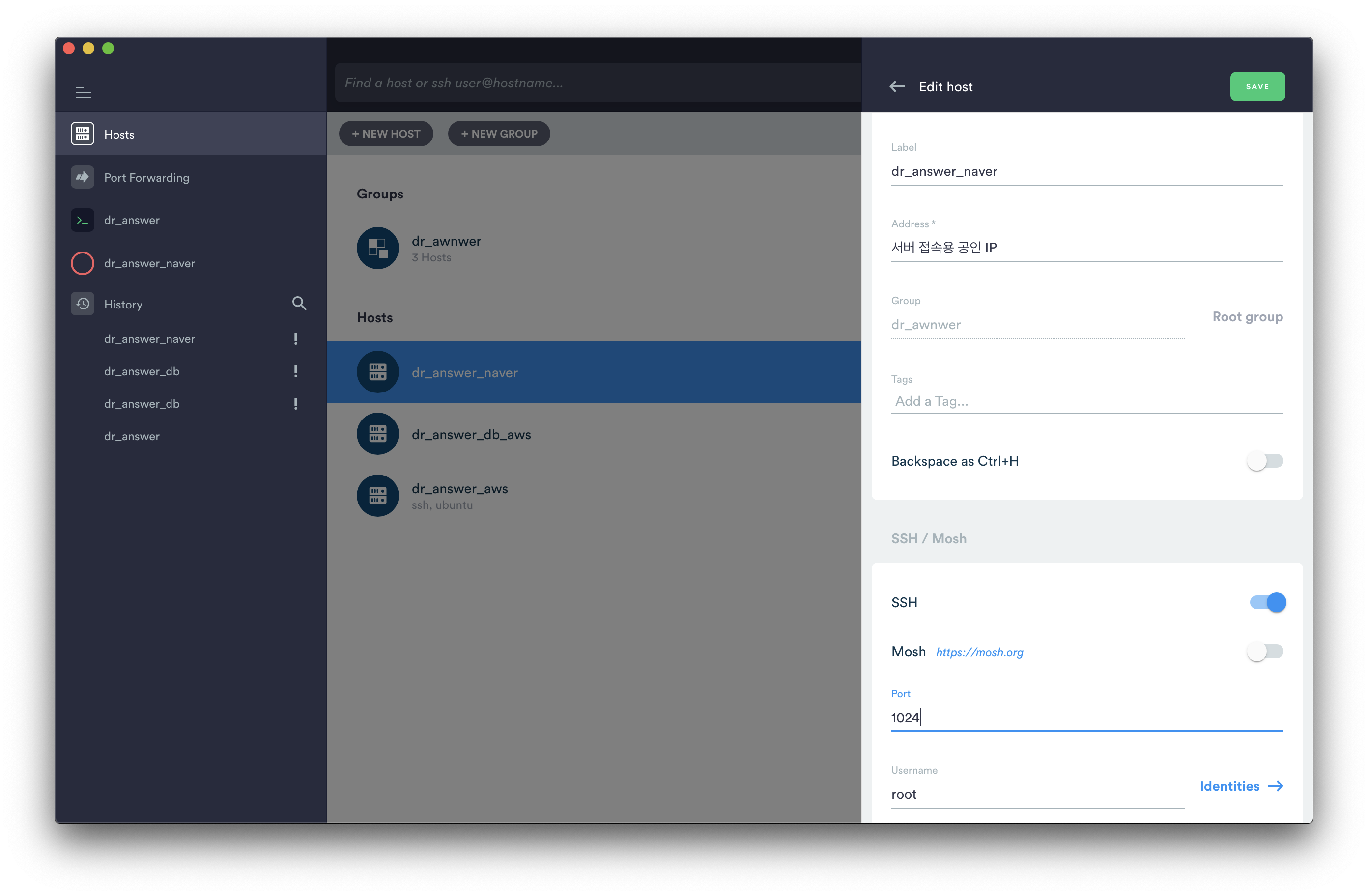 아래와 같이 Host를 추가한다. (네이버클라우드에서 생성한 서버 정보를 확인하면 알 수 있다)