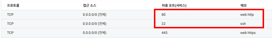 - 22 (ssh) 포트는 putty, terminus 등을 이용해 SSH 접속 시 사용됨