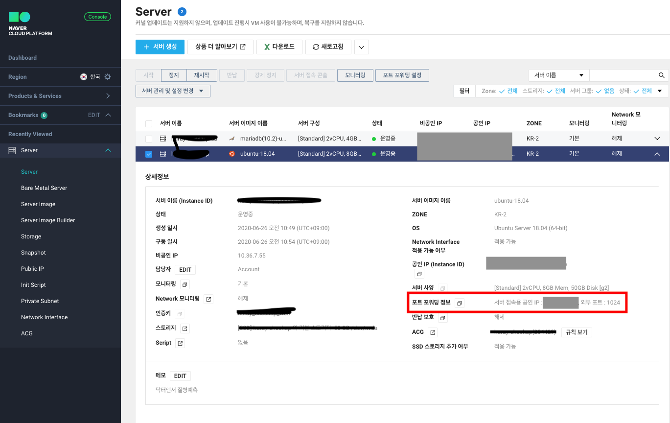 네이버는 조금 독특하게 인스턴스가 한 겹 감싸져 있다. 위에서 말하는 포트 포워딩 정보가 뜻하는 바는, 내가 생성한 인스턴스와 네이버에서 제공하는 내 계정의 사설IP+PORT를 몇 번 포트로 연결할 것이냐고 묻는 것이다. 말이 좀 이상한가...ㅎ