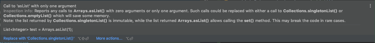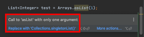 나의 개발 친구 intelliJ가 친절하게 알려주었다. 단일 요소의 배열에는 asList() 대신 singletonList()를 사용해달라고.