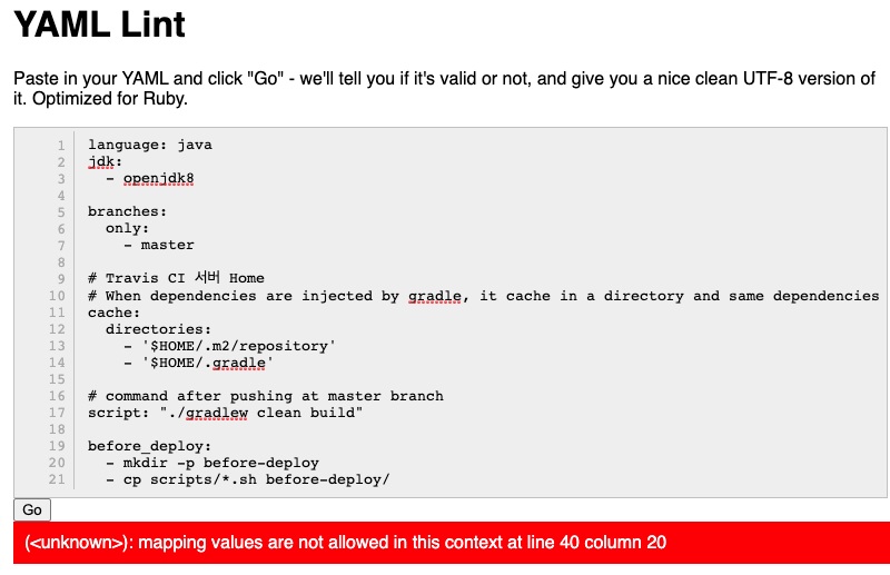 IntelliJ는 별다른 말을 하지 않았는데, 막상 build를 하니 오류가 발생하였다. 업로드한 yml 파일에 문법 오류를 검사하기 위해 yml lint 사이트에 접속하였다.
